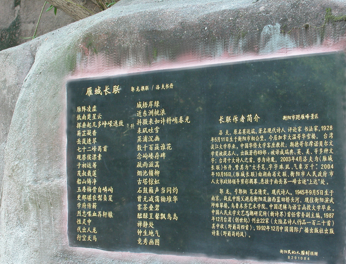 o雁城第一长联 [170字] 於2004,10,16.悬挂在南嶽第一峰回雁峰山门[上达〕侧畔,抒情诗一样窈窕动人。